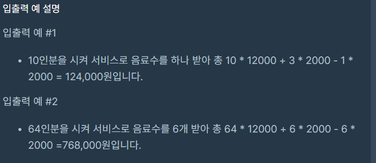 만약, 양꼬치(lamb)를 10인분(n) 이상 먹었다면 총 값(result)에 n을 10으로 나눈 몫을 음료 값 2000과 곱한 값을 빼준 후 다시 result에 넣어줍니다.