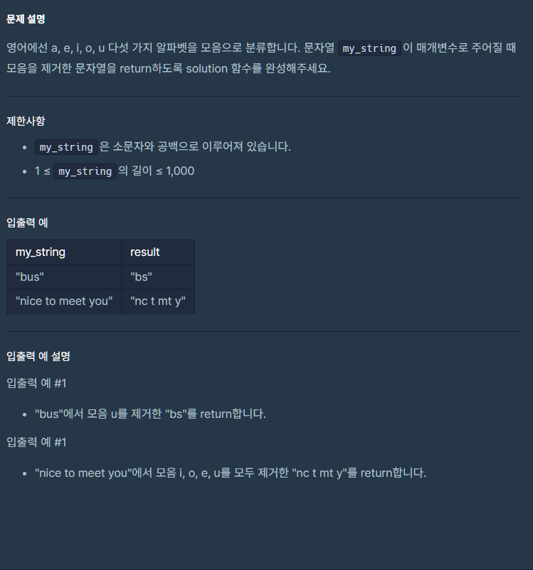 다른 풀이를 살펴보면 replace 함수를 사용하여 모음을 빈값으로 교체해주는 방법이 있습니다.