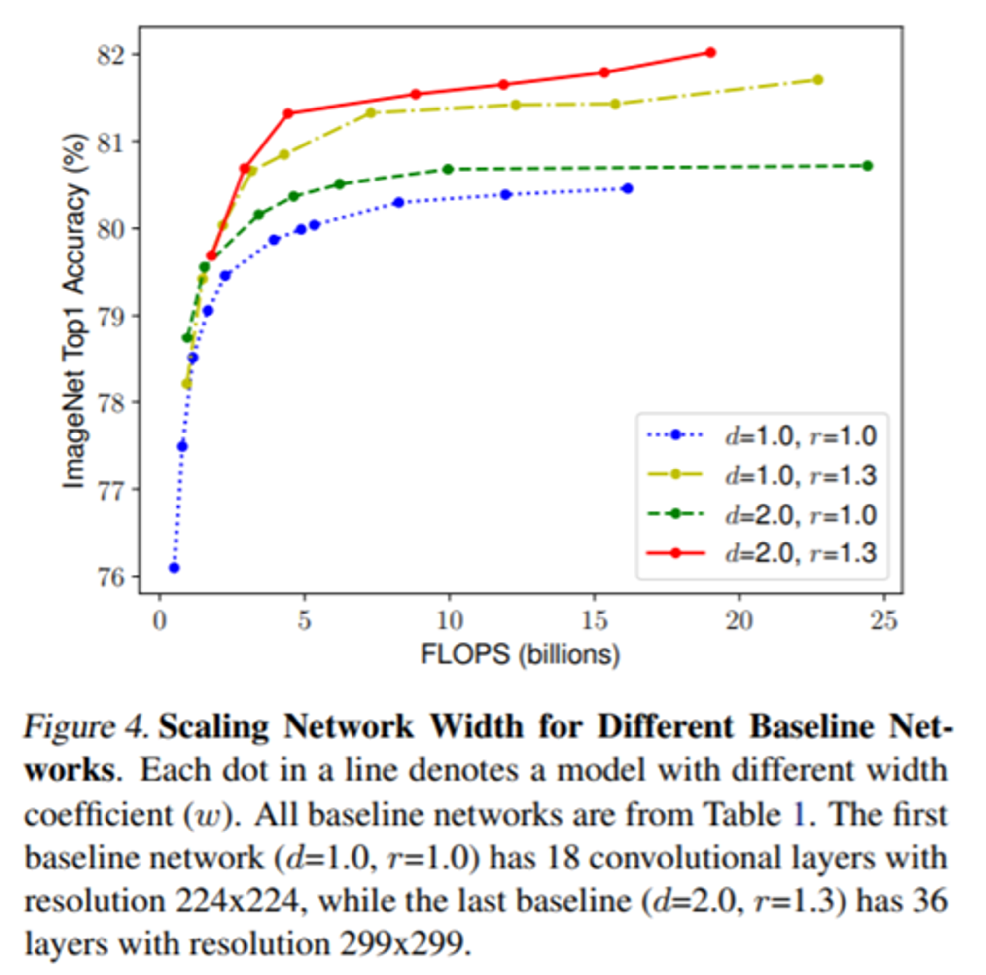 - 위의 그래프를 확인해보면, depth를 키우는 것보다 resolution을 키우는 것이 정확도가 더 좋고, 빨간색을 보면 2가지 값 모두 키운 것이 가장 좋은 것을 알 수 있다.
