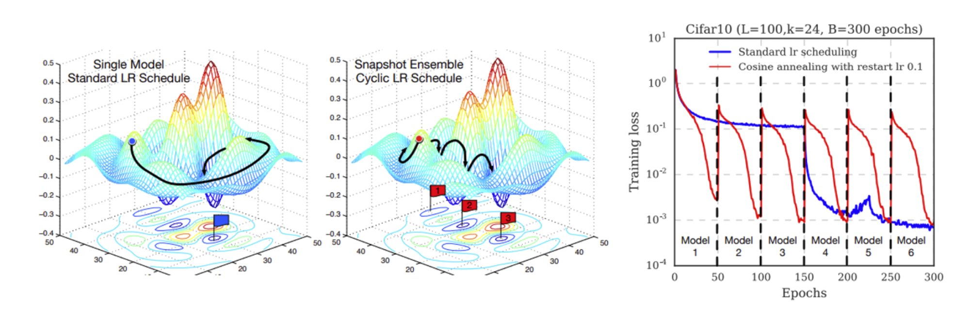 - 위 그림을 보면 cyclical(주기적) lr을 사용하는 모델은 여러 개의 local optima에 도달할 수 있고, 각각의 local optima를 ensemble(앙상블)하고 있다.