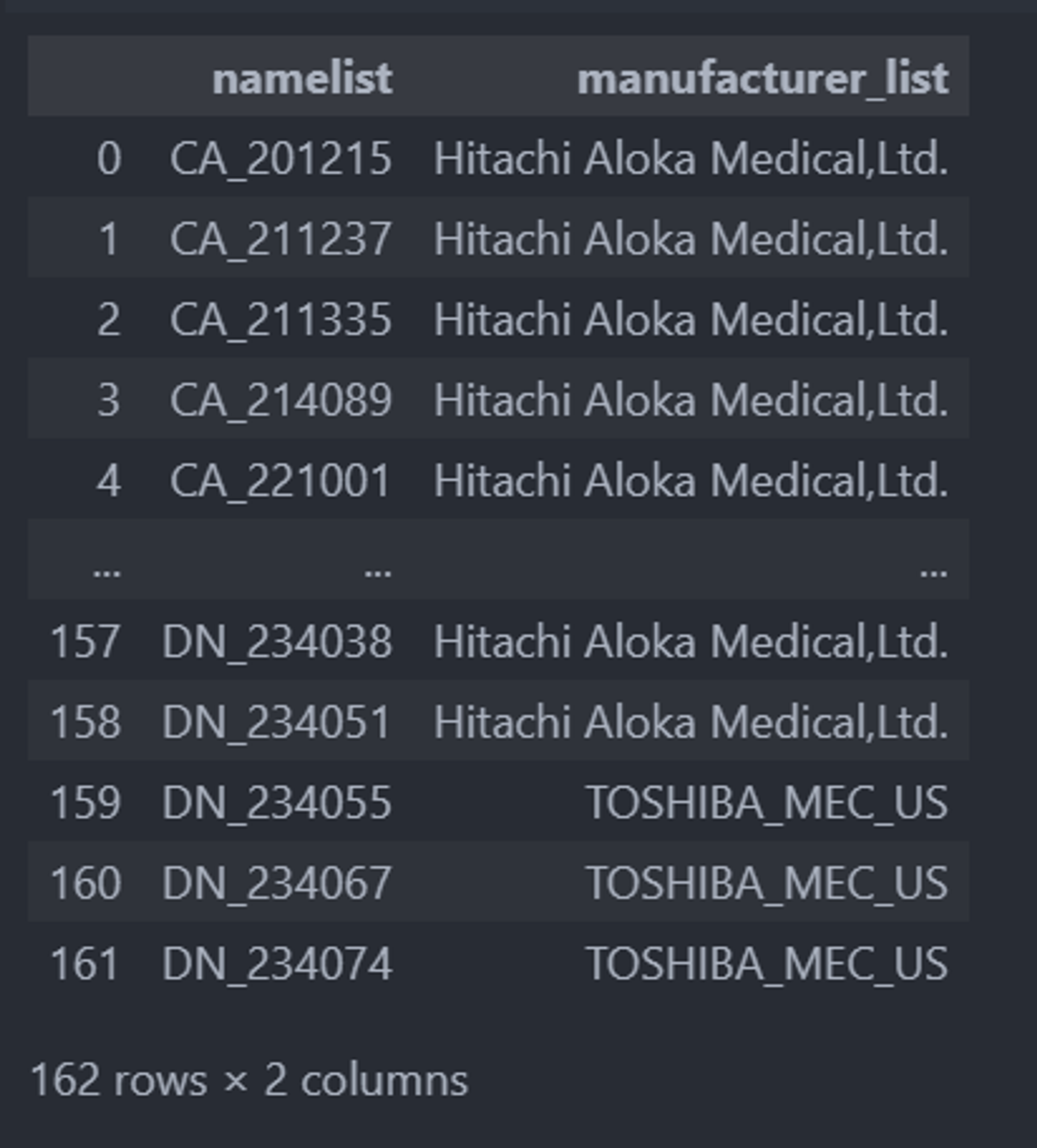 저희의 목표는 아래 사진과 같이 파일의 이름과 dicom 데이터 속 manufacturer정보를 긁어와서 테이블로 만드는 것이 목표입니다.
