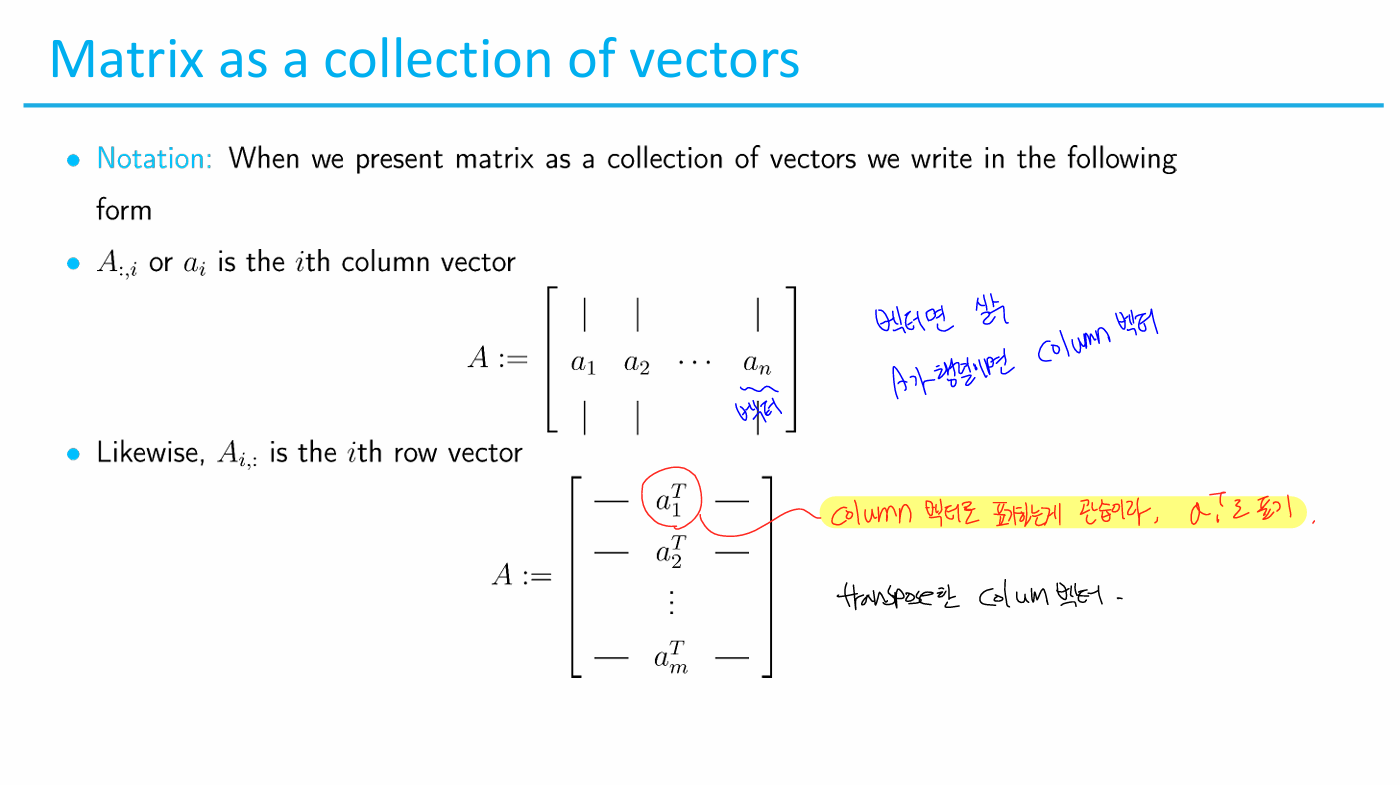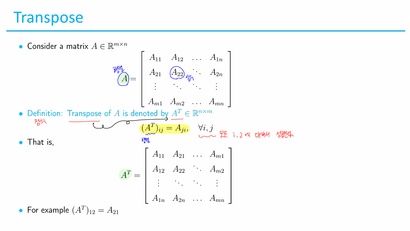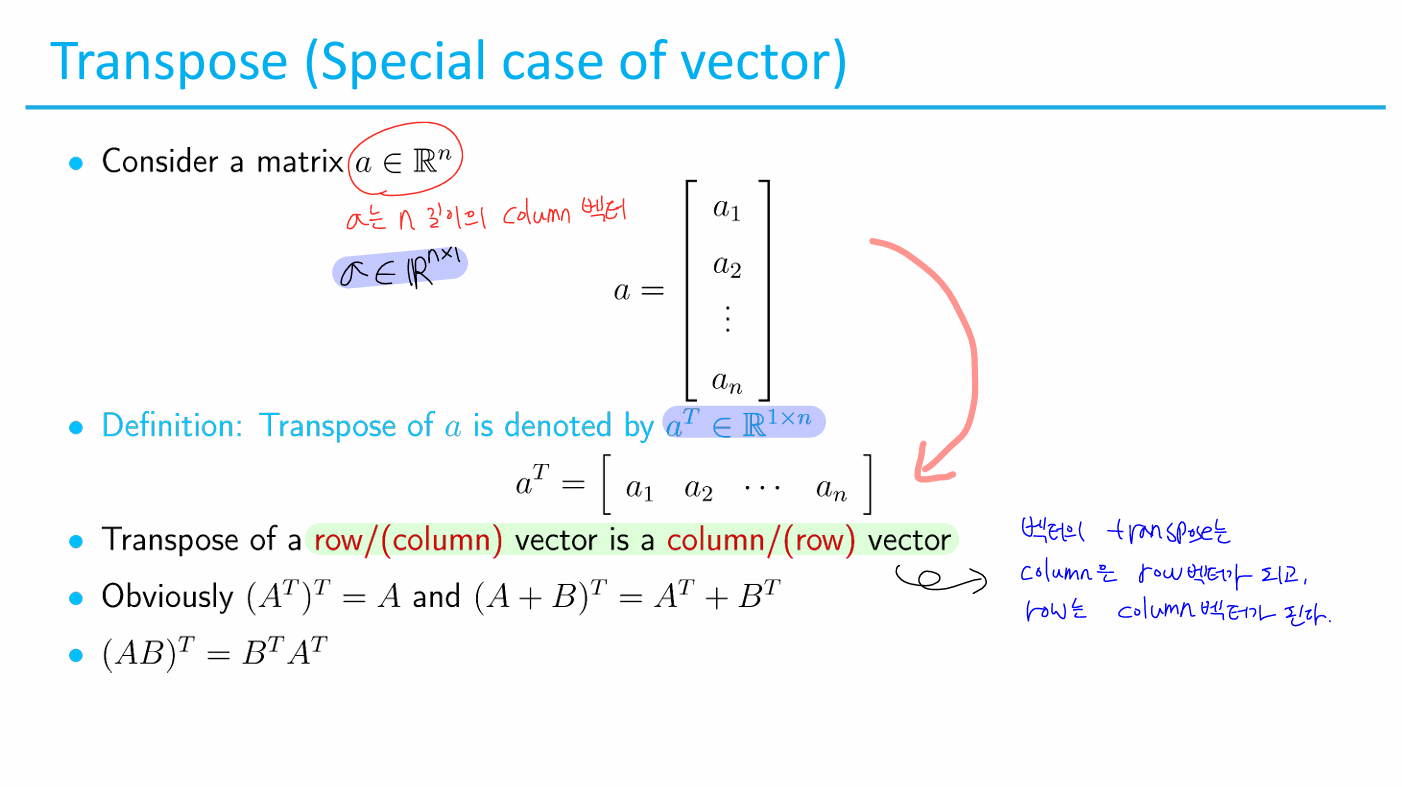 벡터를 transpose하면 column은 row 벡터가 되고, row는 column 벡터가 된다.