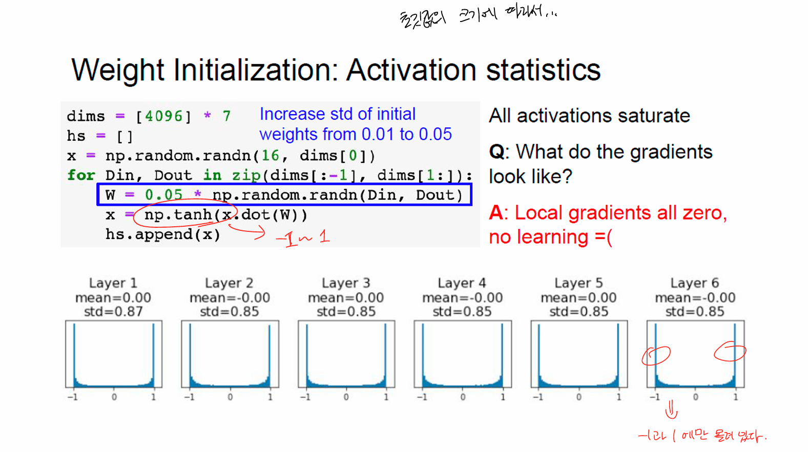 그렇다고 위 코드의 0.05처럼 W를 너무 크게 주면, -1과 1에만 몰려있게 되는 현상을 확인할 수 있다.