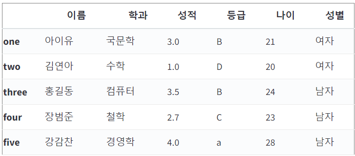 데이터프레임 df의 인덱스 --> Index(['one', 'two', 'three', 'four', 'five'], dtype='object')