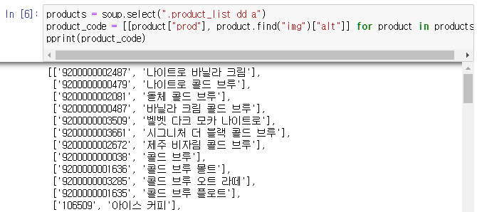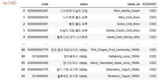스타벅스 음료의 코드, 한글, 영어 이름을 크롤링 하여 각각 code, name, name_en 변수에 넣어주었습니다.
